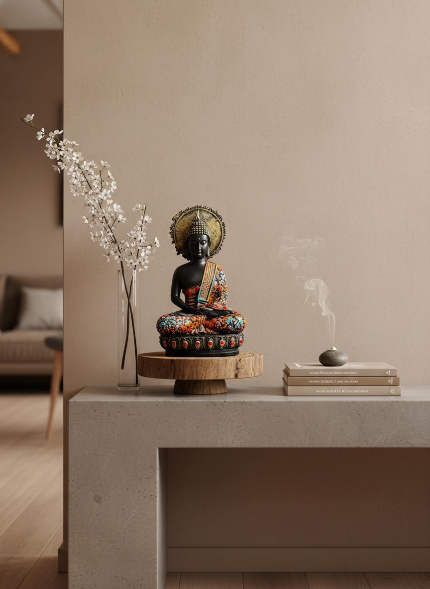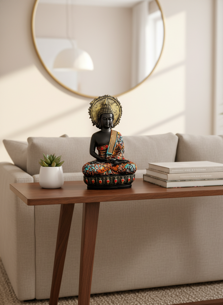 Bring peace, positivity and elegance to your space with this Decorative Sitting Buddha Statue. Crafted with fine detail and vibrant colors, this Buddha idol creates a calming atmosphere wherever placed. Suitable for home décor, meditation/yoga rooms, offices or as a thoughtful gift for loved ones. The statue represents calmness, purity and enlightenment — perfect to enhance the spiritual vibe of your surroundings.